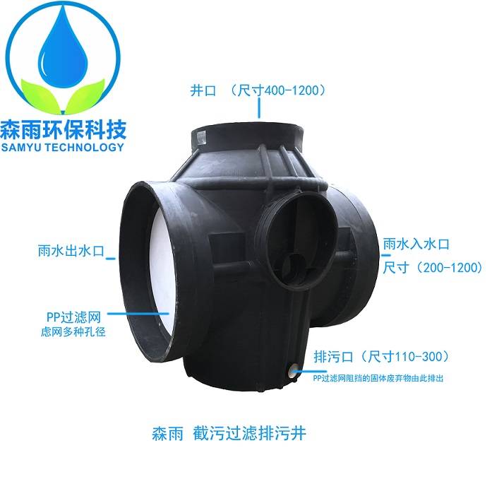 截污過濾井 井內(nèi)底配有個(gè)集水坑 集水坑底部留有個(gè)110排污口,當(dāng)被PP過濾網(wǎng)截住的固體廢棄物就可以在排污口處被部分水流帶走,避免污物堆積過多堵塞慮網(wǎng)導(dǎo)致井過濾功能性喪失。