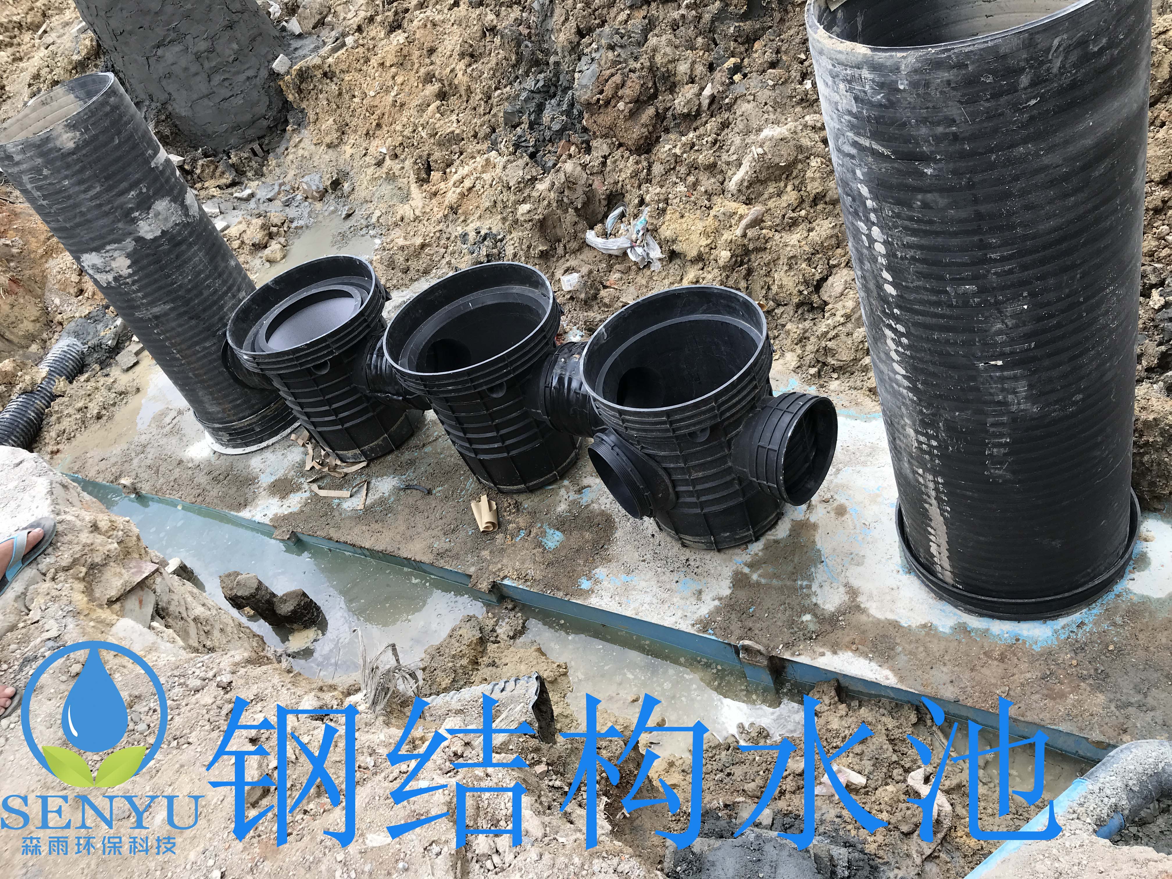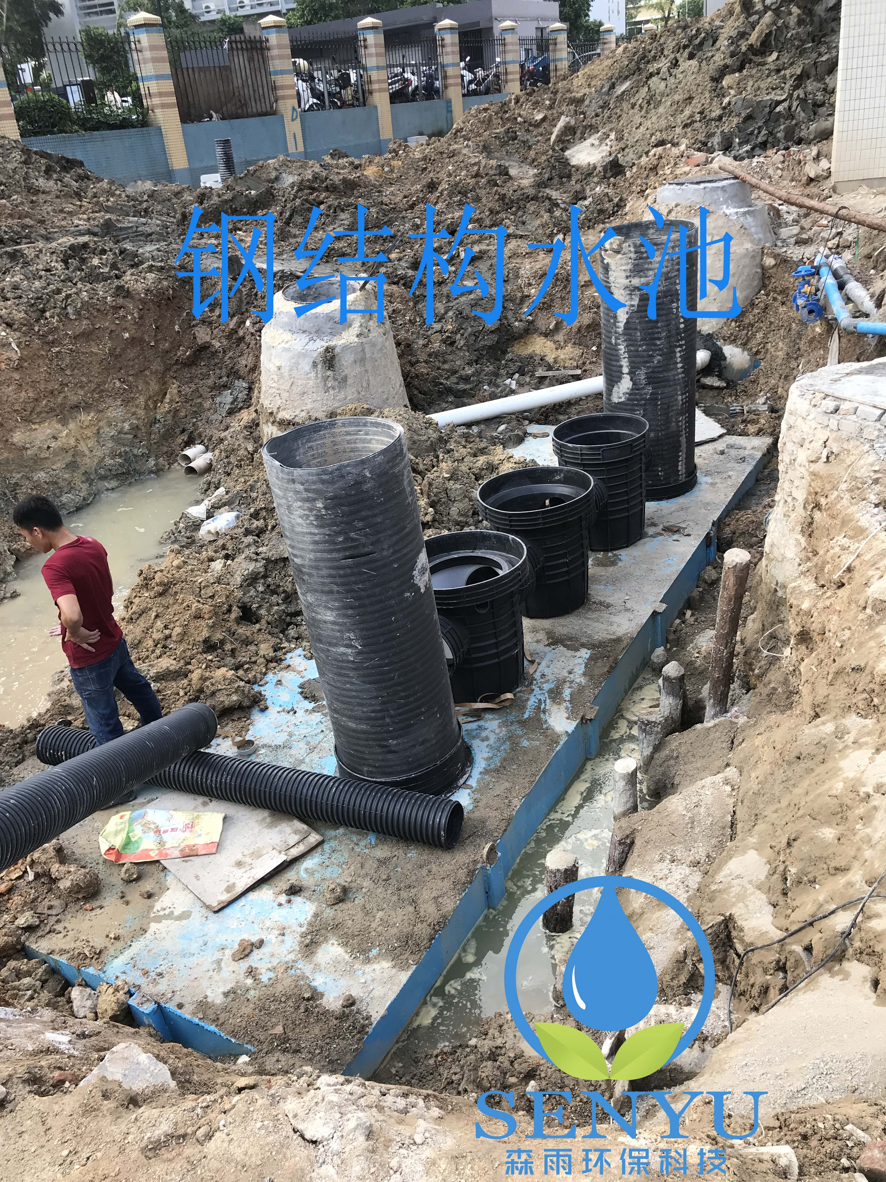 項目雨水收集系統主水池當日即安裝完畢進行回填。本套雨水收集系統清水池與初級蓄水池同在一個鋼結構水池內 水池中間用碳鋼板隔開,水池上方兩邊處各設有一檢修連接口,可連接檢查井。水池內外壁噴涂富辛底漆和面漆做防銹處理。